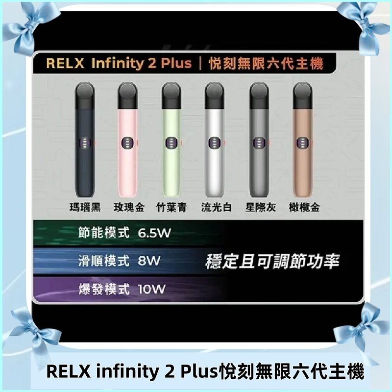 RELX六代主機,也稱為RELX Infinity,是悅刻品牌推出的一款高端電子煙設備,旨在提供卓越的使用體驗。時尚簡約的設計,機身採用高品質的鋁合金材質,手感舒適且堅固耐用。支持無線充電和快速充電,充電更便捷。使用Type-C介面進行快速充電,充電速度更快。搭載最新的FEELM陶瓷霧化技術,提供穩定且豐富的煙霧量和更純淨的口感。RELX Infinity以其優雅的設計、高效的霧化技術和便捷的使用體驗,成為電子煙市場中的佼佼者,深受用戶喜愛。