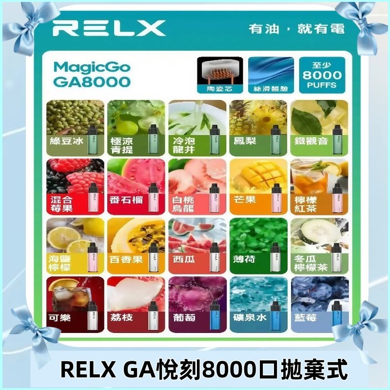 RELX GA8000拋棄式​​是悅刻最新推出的​​高端台灣一次性電子煙​​,採用​​陶瓷霧化芯+透明油倉​​設計,提供​​8000口​​穩定吸感,RELX GA8000​​無需充電,用完即棄,完美解決傳統一次性電子煙​​漏油、焦味、續航短​​等問題,為用戶帶來前所未有的順滑吸感和真實還原的口味體驗。