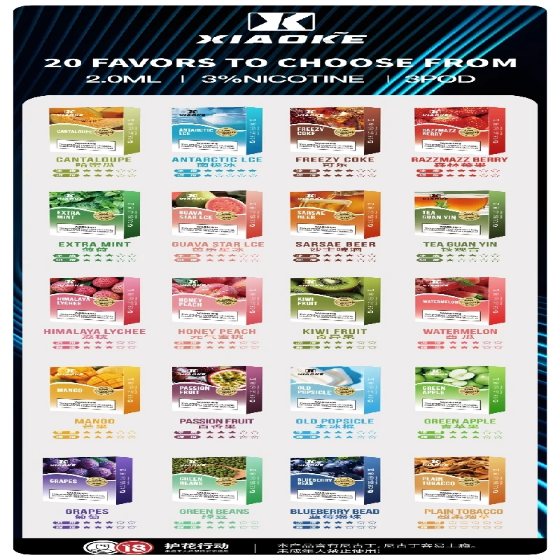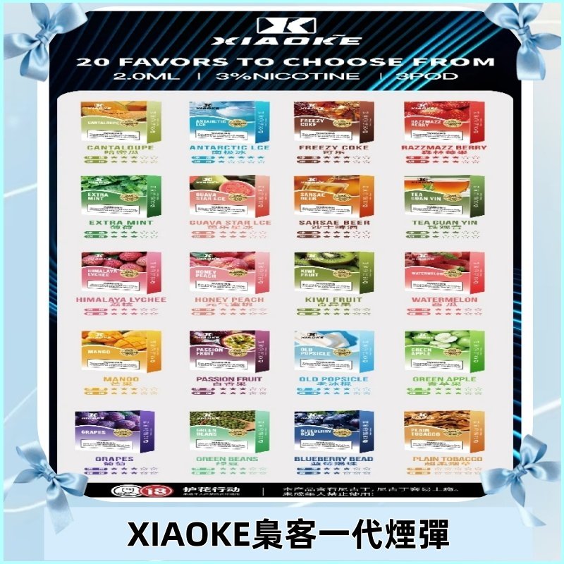 - 20種口味:從高涼度到低涼度不同涼度口味,XIAOKE梟客一代煙彈都能滿足到客戶不同的味蕾。